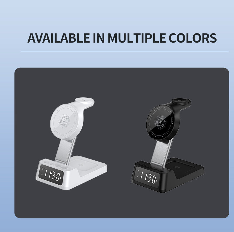 Simplify your nightstand or workspace with this sleek 4-in-1 wireless charging station and digital alarm clock. Designed with a clean modern look, it lets you charge your phone, smartwatch, and wireless earbuds all at once—no tangled cords, just one organized hub. Featuring fast QI-certified wireless charging, an easy-to-read LED clock display, and a durable ABS build, it’s the perfect all-in-one charging solution for home or travel.